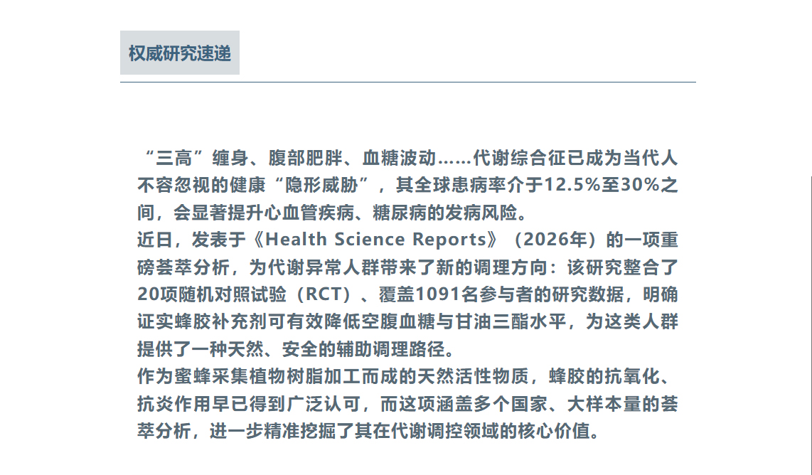 蜂膠科研再出新成果!20 項(xiàng)臨床試驗(yàn)證實(shí)調(diào)控血糖血脂精準(zhǔn),代謝綜合征人群新福音
